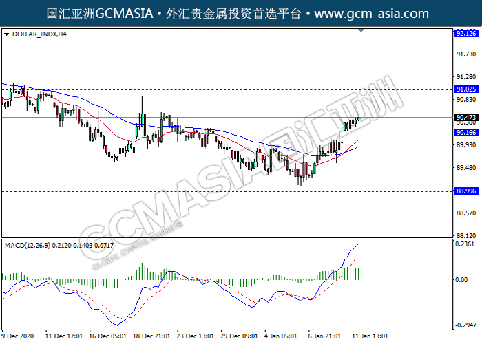 DOLLAR_INDX,H4:美元突破前期压力,多头排列。MACD动能持续略增,中期继续看多为主。上方关91.00压力和92.10压力,下方关注90.15支撑和89.00支撑。