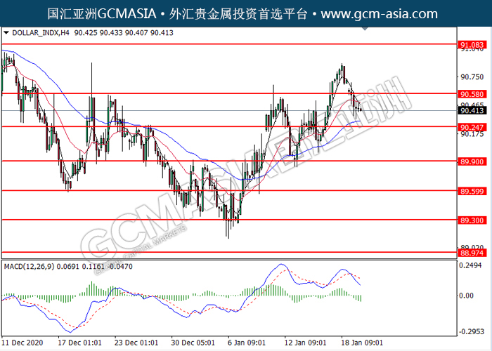 20210120 DOLLAR_INDX by willy | Jan 20, 2021 | 美元指数 | 0 comments GCMAsia-DOLLAR_INDX DOLLAR_INDX 2021-01-20 DOLLAR_INDX,H4:美指突破后持续下行。MACD空头动能转强,短期可关注空头为主。上方关90.60压力和91.10压力,下方关注90.25支撑和89.90支撑。