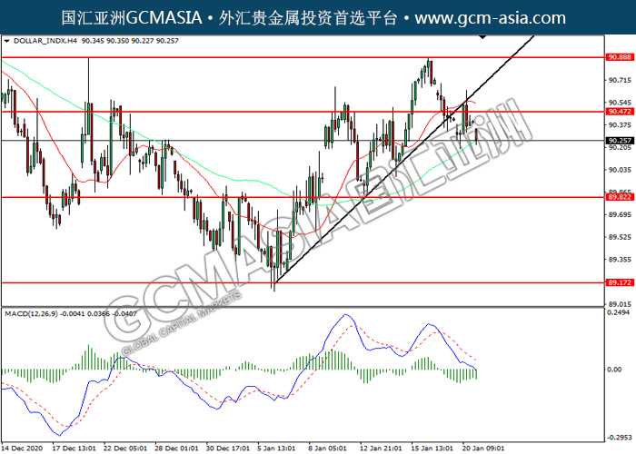 DOLLAR_INDX,H4:美元近期高位承压回落下跌。MACD显示空头信号,动能略减,短期可继续关注空头回调趋势为主。上方关90.45压力和90.90压力,下方关注89.80支撑和89.15支撑。