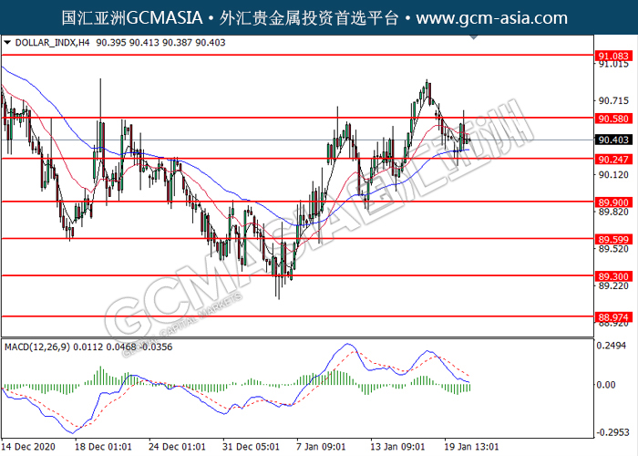 20210121 DOLLAR_INDX by willy | Jan 21, 2021 | 美元指数 | 0 comments GCMAsia-DOLLAR_INDX DOLLAR_INDX 2021-01-21 DOLLAR_INDX,H4:美指高位承压后回落。MACD空头动能偏强,短期可关注空头为主。上方关90.60压力和91.10压力,下方关注90.25支撑和89.90支撑。