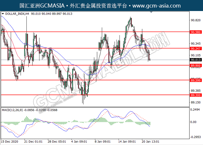 20210122 DOLLAR_INDX by willy | Jan 22, 2021 | 美元指数 | 0 comments GCMAsia-DOLLAR_INDX DOLLAR_INDX 2021-01-22 DOLLAR_INDX,H4:美指突破后持续下行。MACD空头动能偏强,短期可关注空头为主。上方关90.25压力和90.60压力,下方关注89.90支撑和89.60支撑。
