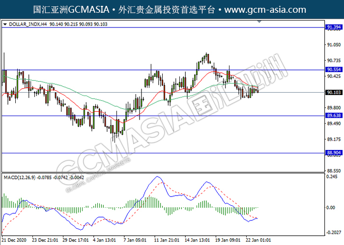 DOLLAR_INDX,H4:美元震荡盘整靠近平均线。然而,MACD开始形成金叉,空头动能略减,短期关注多头趋势为主。上方关90.55压力和91.40压力,下方关注89.65支撑和88.90支撑。