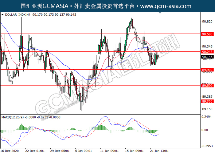 20210125 DOLLAR_INDX by willy | Jan 25, 2021 | 美元指数 | 0 comments GCMAsia-DOLLAR_INDX DOLLAR_INDX 2021-01-25 DOLLAR_INDX,H4:美指低位反弹。MACD空头动能略减,短期可关注多头为主。上方关90.25压力和90.60压力,下方关注89.90支撑和89.60支撑。