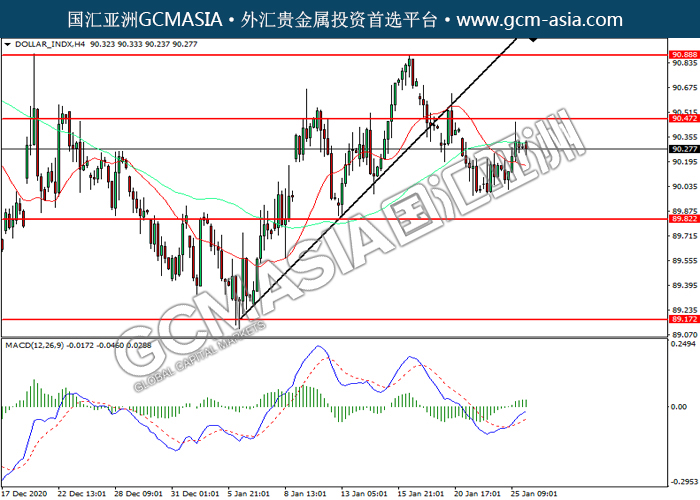 DOLLAR_INDX,H4:美指震荡上行,目前靠近前期压力。MACD开始形成金叉,多头动能略增,若突破关注多头趋势为主。上方关90.45压力和90.90压力,下方关注89.80支撑和89.15支撑。