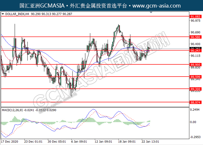 20210126 DOLLAR_INDX by willy | Jan 26, 2021 | 美元指数 | 0 comments GCMAsia-DOLLAR_INDX DOLLAR_INDX 2021-01-26 DOLLAR_INDX,H4:美指突破后持续上行。MACD多头动能略增,短期可关注多头为主。上方关90.60压力和91.10压力,下方关注90.25支撑和89.90支撑。