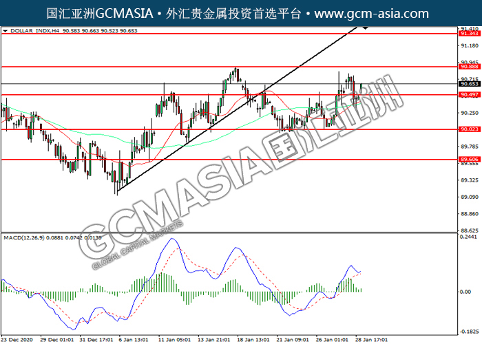 DOLLAR_INDX,H4:美元低位反弹。MACD多头动能略增,短期关注多头趋势为主。上方关90.90压力和91.35压力,下方关注90.50支撑和90.00支撑。