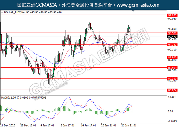 20210129 DOLLAR_INDX by willy | Jan 29, 2021 | 美元指数 | 0 comments GCMAsia-DOLLAR_INDX DOLLAR_INDX 2021-01-29 DOLLAR_INDX,H4:美指突破后持续下行。MACD多头动能略减,短期可关注空头为主。上方关90.60压力和91.10压力,下方关注90.25支撑和89.90支撑。