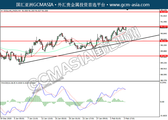 DOLLAR_INDX,H4:美元震荡上行,目前测试前期压力。然而,MACD多头动能略减,短期关注技术性回调为主。上方关91.20压力和92.05压力,下方关注90.45支撑和89.60支撑。