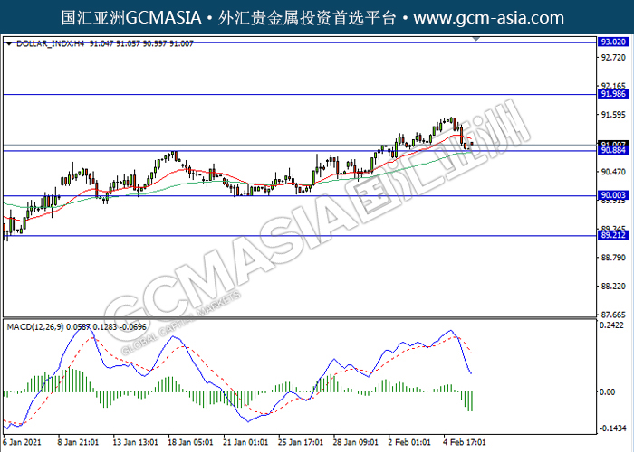 DOLLAR_INDX,H4:美元高位承压回落,目前测试前期支撑。MACD动能持续略减,若突破继续看空为主。上方关92.00压力和93.00压力,下方关注90.90支撑和90.00支撑。
