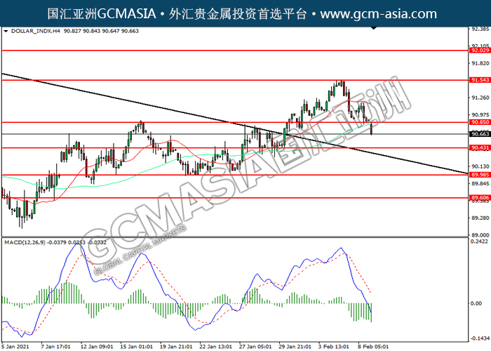 DOLLAR_INDX,H4:美指下破前期支撑,震荡下行。MACD空头动能持续略增,短期可看空为主。上方关90.85压力和91.55压力,下方关注90.45支撑和90.00支撑。