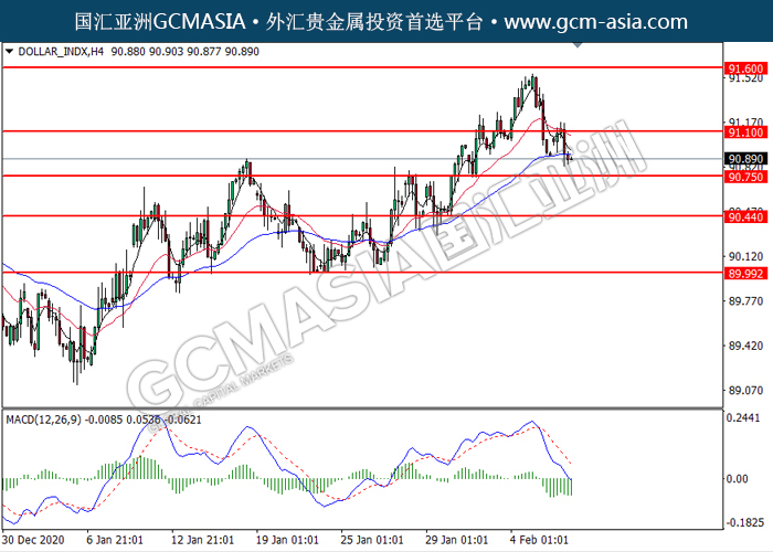 DOLLAR_INDX,H4:美元高位承压后回落。MACD空头动能略增,短期可关注空头趋势为主。上方关91.10压力和91.60压力,下方关注90.75支撑和90.45支撑。
