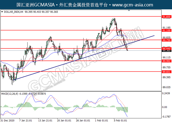 DOLLAR_INDX,H4:美元突破后持续下行。MACD空头动能略增,短期可关注空头趋势为主。上方关90.45压力和90.75压力,下方关注90.00支撑和89.60支撑。