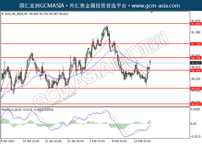 DOLLAR_INDX,H4:美元突破后持续上行。MACD多头动能略增,短期可关注多头趋势为主。上方关90.75压力和91.10压力,下方关注90.45支撑和90.00支撑。