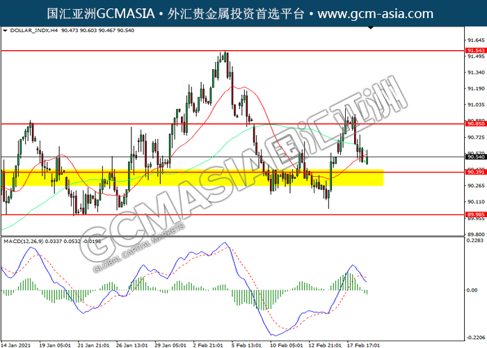 20210219 DOLAR_INDX-午间 by keyk | Feb 19, 2021 | 美元指数 | 0 comments GCMAsia-DOLLAR_INDX DOLLAR_INDX 2021-02-19 DOLLAR_INDX,H4:美元高位承压回落。MACD空头动能持续略增,短期可关注空头为主。上方关90.85压力和91.55压力,下方关注90.40支撑和90.00支撑。