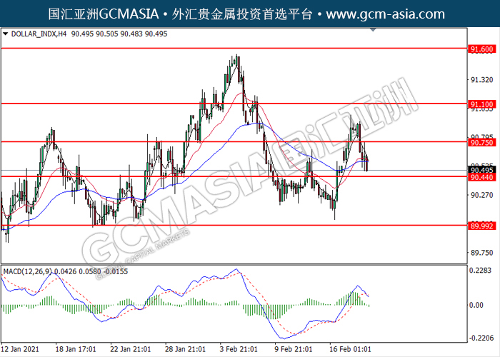 DOLLAR_INDX,H4:美元突破后持续下行。MACD空头动能略增,短期可关注空头趋势为主。上方关90.75压力和91.10压力,下方关注90.45支撑和90.00支撑。