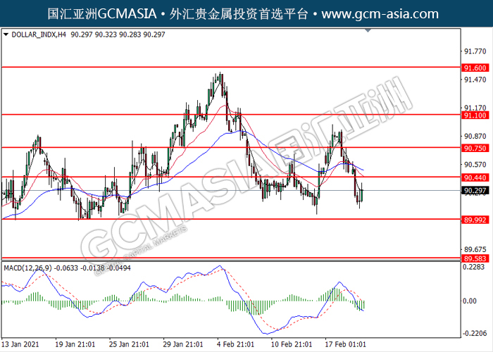 20210222 DOLLAR_INDX by willy | Feb 22, 2021 | 美元指数 | 0 comments GCMAsia - DOLLAR_INDX DOLLAR_INDX 2021-02-22 DOLLAR_INDX,H4:美元低位反弹。MACD空头动能略减,短期可关注多头趋势为主。上方关90.45压力和90.75压力,下方关注90.00支撑和89.60支撑。