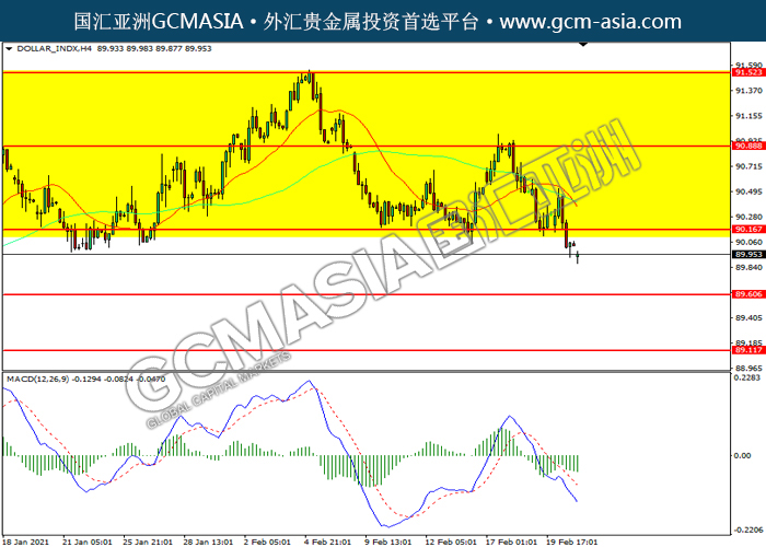 DOLLAR_INDX,H4:美指下破前期支撑,震荡下行。MACD空头动能略增,短期可关注空头为主。上方关90.15压力和90.85压力,下方关注89.60支撑和89.10支撑。