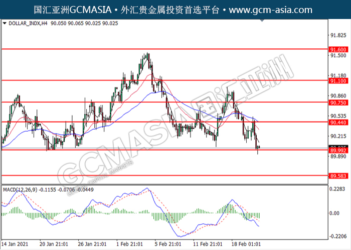 DOLLAR_INDX,H4:美元高位承压后回落,目前测试着支撑位。MACD空头动能略增,若突破可关注空头趋势为主。上方关90.45压力和90.75压力,下方关注90.00支撑和89.60支撑。