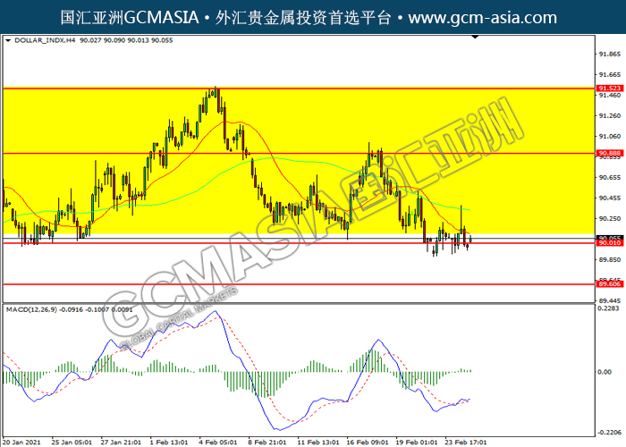 DOLLAR_INDX,H4:美指震荡下行,目前测试前期支撑。然而,MACD多头动能略减,若下破可关注空头为主。上方关90.90压力和91.50压力,下方关注90.00支撑和89.60支撑。