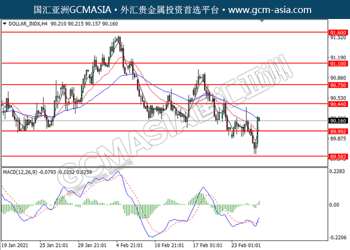 20210226 DOLLAR_INDX by willy | Feb 26, 2021 | 美元指数 | 0 comments GCMAsia - DOLLAR_INDX DOLLAR_INDX 2021-02-26 DOLLAR_INDX,H4:美元突破后持续上行。MACD多头动能略增,短期可关注多头为主。上方关90.45压力和90.75压力,下方关注90.00支撑和89.60支撑。