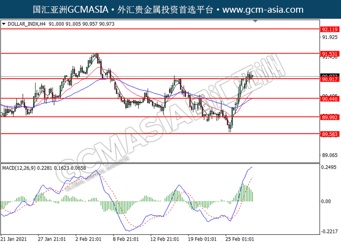 DOLLAR_INDX,H4:美元突破后持续上行。然而,MACD多头动能略减,短期可关注技术性回调为主。上方关91.55压力和92.10压力,下方关注90.90支撑和90.45支撑。