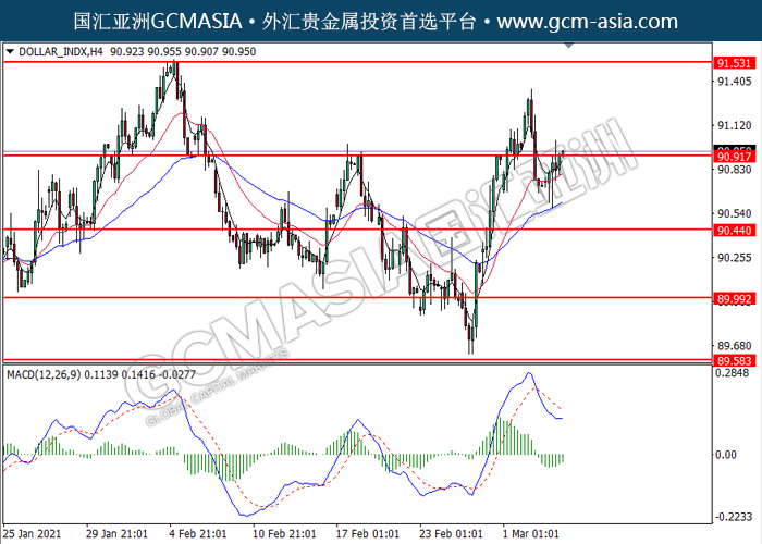 DOLLAR_INDX,H4:美元低位反弹,目前测试着压力位。MACD空头动能略减,若突破可关注多头为主。上方关90.90压力和91.55压力,下方关注90.45支撑和90.00支撑。