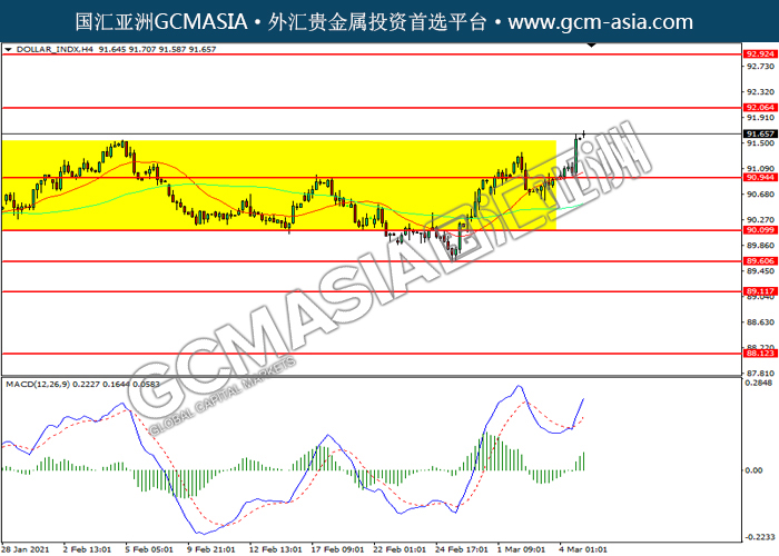 DOLLAR_INDX,H4:美指突破前期压力,持续上行。MACD多头动能略增,短期可关注多头为主。上方关92.05压力和92.90压力,下方关注90.95支撑和90.10支撑。