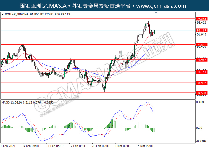 DOLLAR_INDX,H4:美元低位反弹,目前测试着压力位。MACD空头动能略减,若突破可关注多头为主。上方关92.10压力和92.60压力,下方关注91.55支撑和90.90支撑。