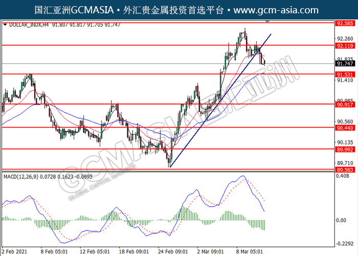 20210311 DOLLAR_INDX_午间 by keyk | Mar 11, 2021 | 美元指数 | 0 comments GCMAsia-DOLLAR_INDX DOLLAR_INDX 2021-03-11 DOLLAR_INDX,H4:美元突破后持续下行。MACD空头动能略增,短期可关注空头为主。上方关92.10压力和92.60压力,下方关注91.55支撑和90.90支撑。