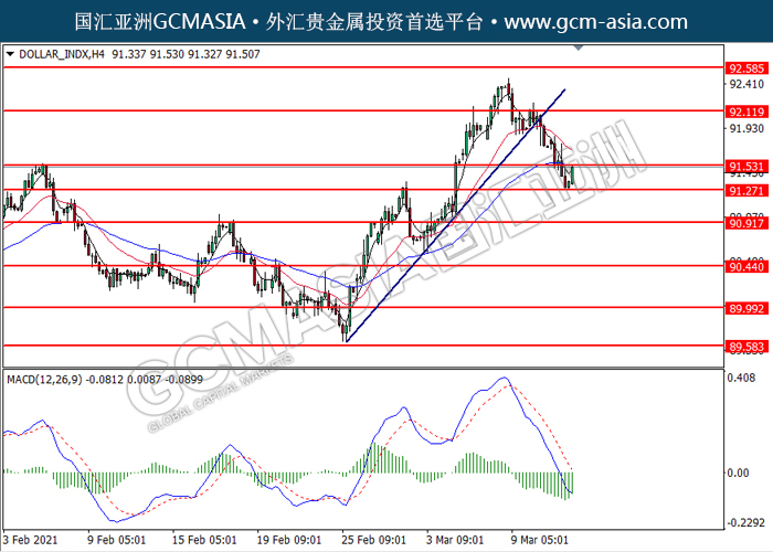 DOLLAR_INDX,H4:美元低位反弹,目前测试着压力位。MACD空头动能略减,若突破可关注多头为主。上方关91.55压力和92.10压力,下方关注91.25支撑和90.90支撑。