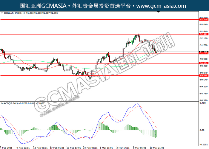 DOLLAR_INDX,H4:美指震荡下行,目前测试前期支撑。MACD空头动能略增,若下破可关注空头为主。上方关92.45压力和93.35压力,下方关注91.25支撑和90.65支撑。