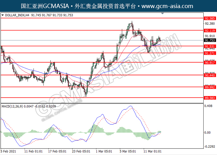 20210316 DOLLAR_INDX by willy | Mar 16, 2021 | 美元指数 | 0 comments GCMAsia - DOLLAR_INDX DOLLAR_INDX 2021-03-16 DOLLAR_INDX,H4:美元低位反弹。MACD多头动能偏强,短期可关注多头为主。上方关92.10压力和92.60压力,下方关注91.55支撑和91.35支撑。