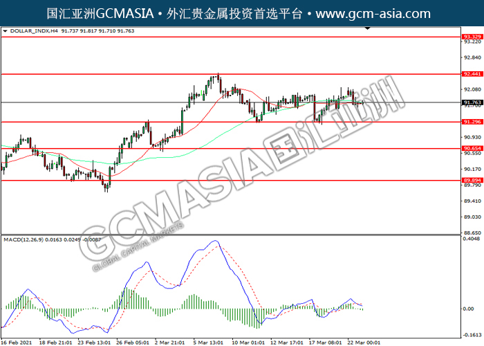 20210323 DOLLAR-INDX-午间 by keyk | Mar 23, 2021 | 美元指数 | 0 comments GCMAsia-DOLLAR_INDX DOLLAR_INDX 2021-03-23 DOLLAR_INDX,H4:美元震荡下行。MACD空头动能略增,短期可关注空头为主。上方关92.45压力和93.35压力,下方关注91.30支撑和90.65支撑。