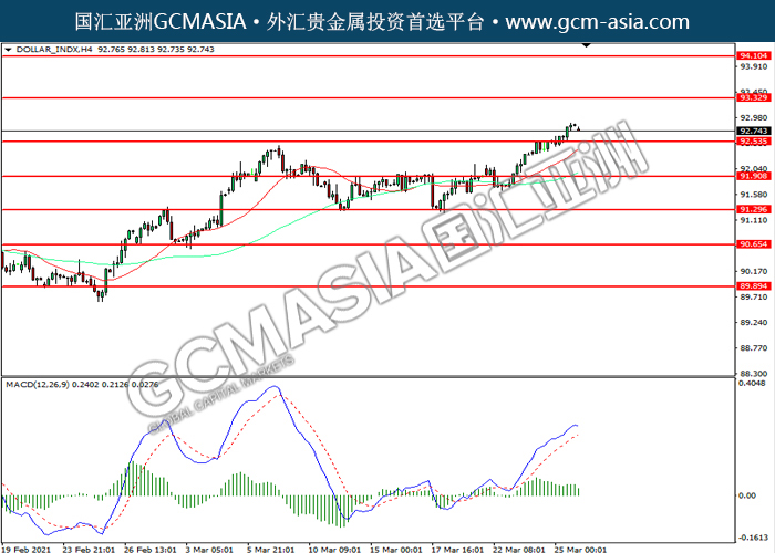 DOLLAR_INDX,H4:美指突破前期压力,震荡上行。然而,MACD多头动能略减,短期可技术性回调为主。上方关93.35压力和94.10压力,下方关注92.55支撑和91.90支撑。