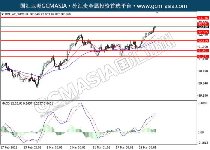 20210326 DOLLAR_INDX by willy | Mar 25, 2021 | 美元指数 | 0 comments GCMAsia - DOLLAR_INDX DOLLAR_INDX 2021-03-26 DOLLAR_INDX,H4:美元突破后持续上行。MACD多头动能略增,短期可关注多头为主。上方关93.00压力和93.35压力,下方关注92.60支撑和92.10支撑。