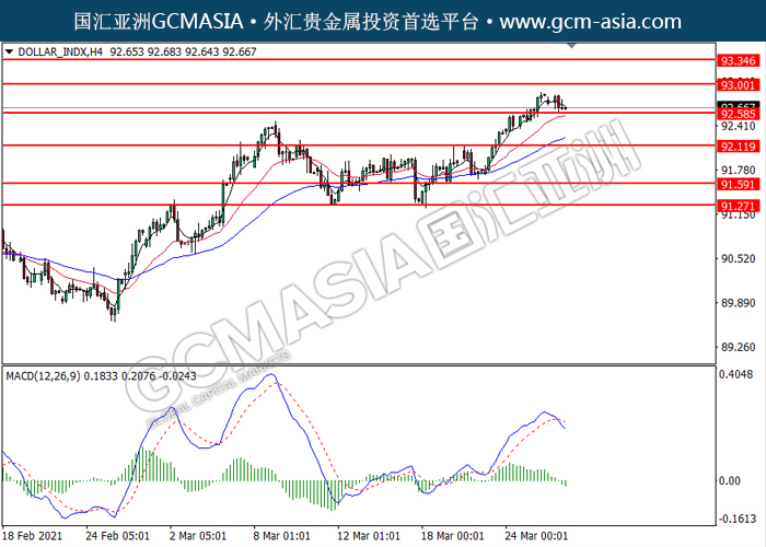 DOLLAR_INDX,H4:美元高位承压后回落,目前测试着支撑位。MACD空头动能略增,若突破可关注空头为主。上方关93.00压力和93.35压力,下方关注92.60支撑和92.10支撑。