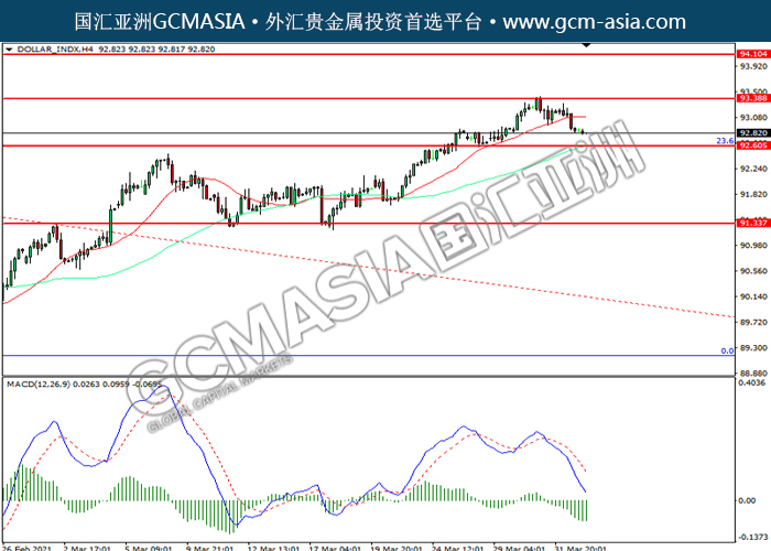 20210402 DOLLAR_INDX-午间 by keyk | Apr 2, 2021 | 美元指数 | 0 comments GCMAsia-DOLLAR_INDX DOLLAR_INDX 2021-04-02 DOLLAR_INDX,Daily:美指震荡下行。MACD空头动能略增,短期可关注空头为主。上方关93.40压力和94.10压力,下方关注92.60支撑和91.35支撑。