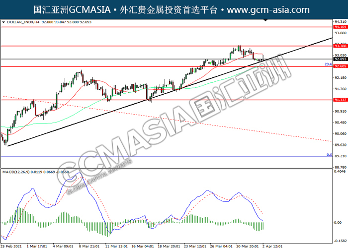 20210405 DOLLAR_INDX by willy | Apr 5, 2021 | 美元指数 | 0 comments GCMAsia-DOLLAR_INDX DOLLAR_INDX 2021-04-05 DOLLAR_INDX,H4:美指震荡下行。MACD空头动能略增,短期可关注空头为主。上方关93.40压力和94.10压力,下方关注92.60支撑和91.35支撑。
