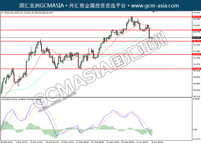 DOLLAR_INDX,H4:美指震荡下行,目前测试前期支撑。MACD空头动能略增,若下破可关注空头为主。上方关92.85压力和93.35压力,下方关注92.40支撑和91.85支撑。