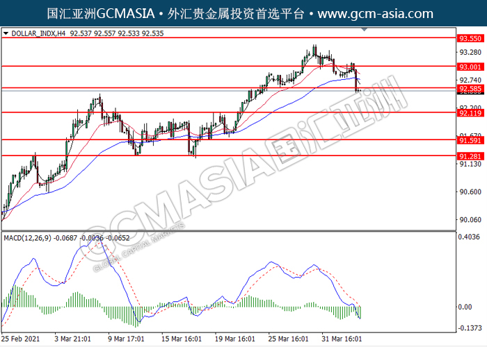 20210406 DOLLAR_INDX by willy | Apr 6, 2021 | 美元指数 | 0 comments GCMAsia - DOLLAR_INDX DOLLAR_INDX 2021-04-06 DOLLAR_INDX,H4:美元突破后持续下行。MACD空头动能略增,短期可关注空头为主。上方关92.60压力和93.00压力,下方关注92.10支撑和91.60支撑。
