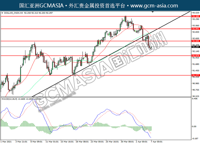DOLLAR_INDX,H4:美指震荡下行,持续下行。MACD空头动能略减,短期可关注技术性回调为主。上方关92.50压力和92.95压力,下方关注91.95支撑和91.25支撑。