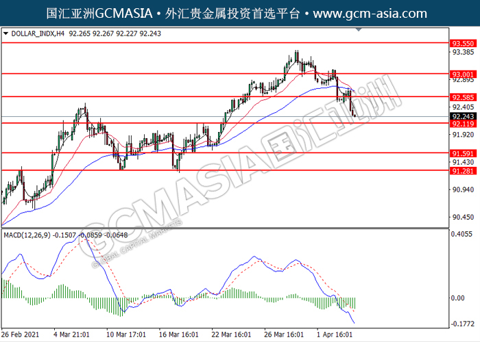 20210407 DOLLAR_INDX by willy | Apr 6, 2021 | 美元指数 | 0 comments GCMAsia - DOLLAR_INDX DOLLAR_INDX 2021-04-07 DOLLAR_INDX,H4:美元突破后持续下行。MACD空头动能略增,短期可关注空头为主。上方关92.60压力和93.00压力,下方关注92.10支撑和91.60支撑。