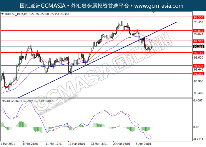 DOLLAR_INDX,H4:美元低位反弹。MACD空头动能略减,短期可关注多头为主。上方关92.60压力和93.00压力,下方关注92.10支撑和91.60支撑。