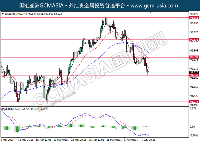 20210409 DOLLAR_INDX by willy | Apr 9, 2021 | 美元指数 | 0 comments GCMAsia-DOLLAR_INDX DOLLAR_INDX 2021-04-09 DOLLAR_INDX,H4:美元高位承压后回落。MACD空头动能略增,短期可关注空头为主。上方关92.40压力和92.85压力,下方关注91.95支撑和91.25支撑。