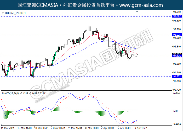 DOLLAR_INDX,H4:美元震荡盘整并且测试前期支撑。然而,MACD形成金叉,动能略增,短期关注多头方向为主。上方关93.30压力和93.80压力,下方关注92.10支撑和91.25支撑。
