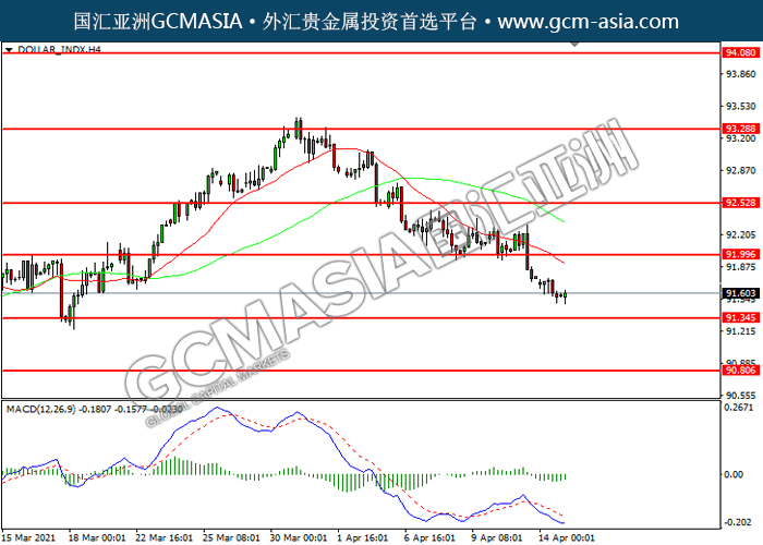 DOLLAR_INDX,H4:美指下破前期支撑,持续下行。然而,MACD空头动能略减,短期可关注技术性回调为主。上方关92.00压力和92.55压力,下方关注91.35支撑和90.80支撑。