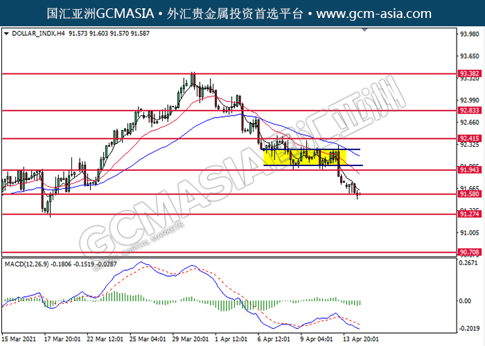 DOLLAR_INDX,H4:美元突破后持续下行,目前测试着支撑位。MACD空头动能偏强,若突破可关注空头趋势为主。上方关91.95压力和92.40压力,下方关注91.60支撑和91.25支撑。