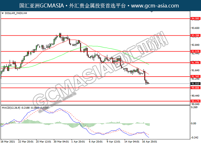 DOLLAR_INDX,H4:美指下破前期支撑,震荡下行。MACD空头动能略增,短期可关注空头为主。上方关91.35压力和92.00压力,下方关注90.80支撑和90.15支撑。