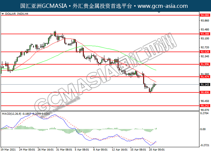 20210421 DOLLAR_INDX by willy | Apr 21, 2021 | 美元指数 | 0 comments GCMAsia-DOLLAR_INDX DOLLAR_INDX 2021-04-21 DOLLAR_INDX,H4:美指震荡上行。MACD已形成金叉,动能转强,短期可关注多头为主。上方关91.45压力和92.00压力,下方关注90.80支撑和90.25支撑。