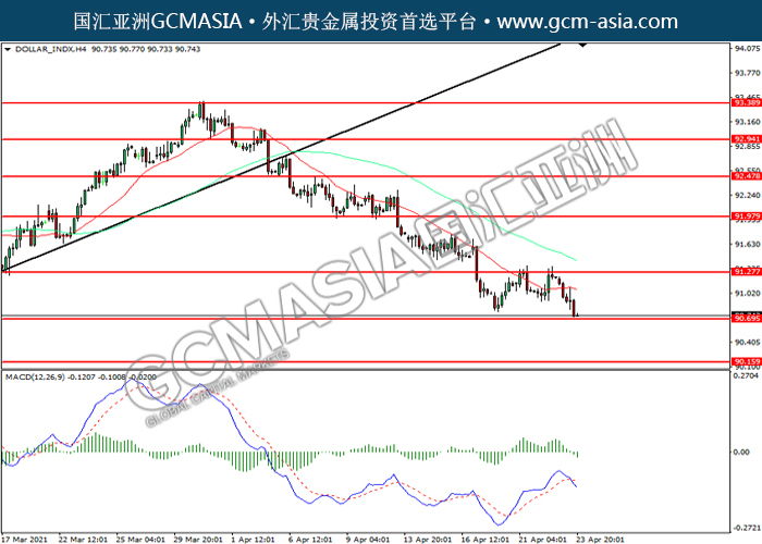 DOLLAR_INDX,H4:美指震荡下行,目前测试前期支撑。MACD已形成死叉,动能转弱,若下破可关注空头为主。上方关91.30压力和91.95压力,下方关注90.70支撑和90.15支撑。